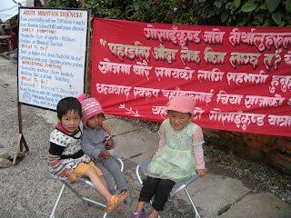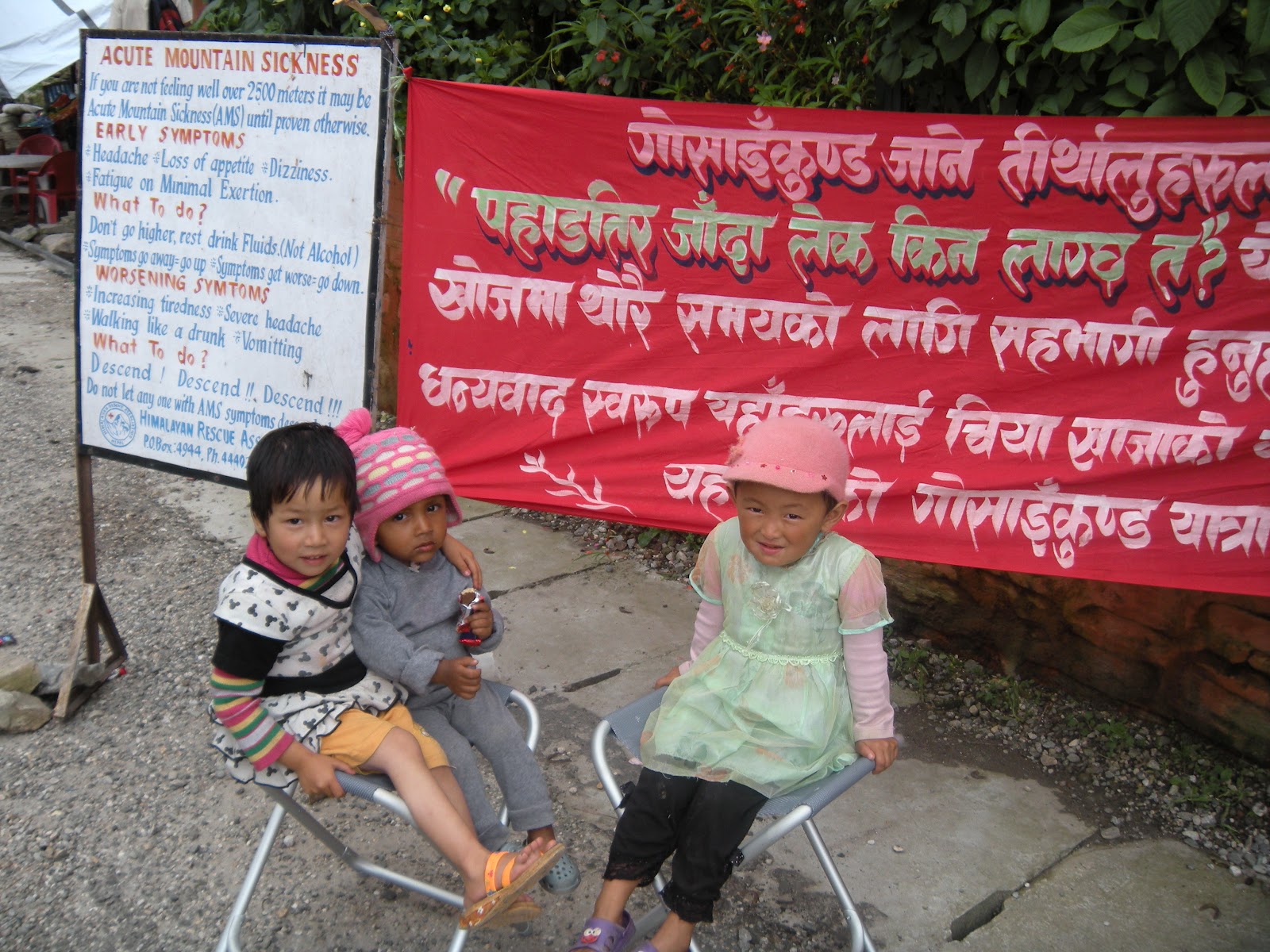 Local kids posing in front of our recruitment poster near the hotel in Dhunche.