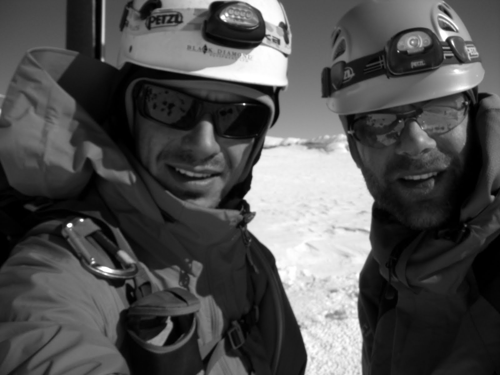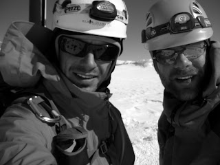 Getting ready to ski with the climbing route in the background. The mountain starting to look pretty bare.